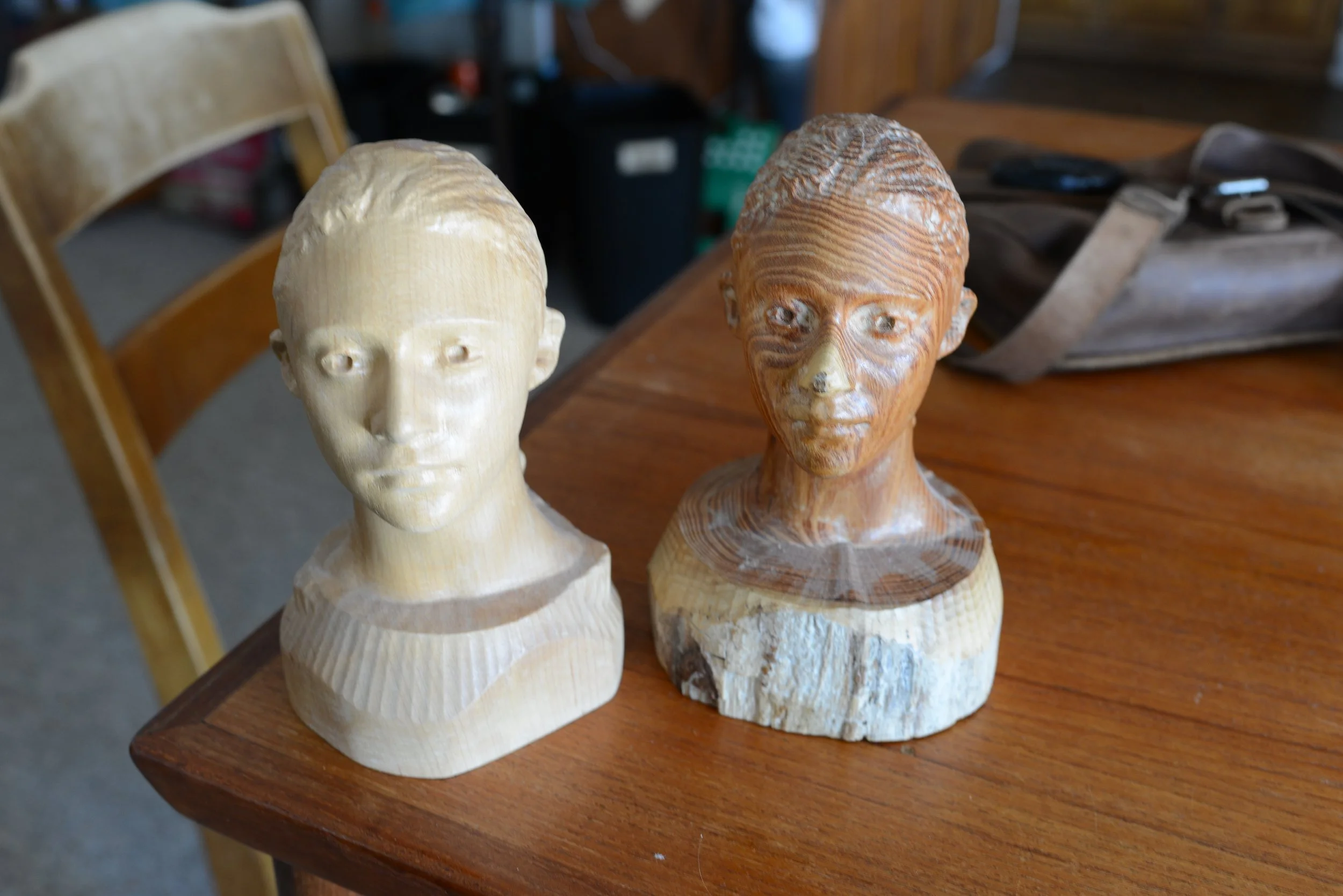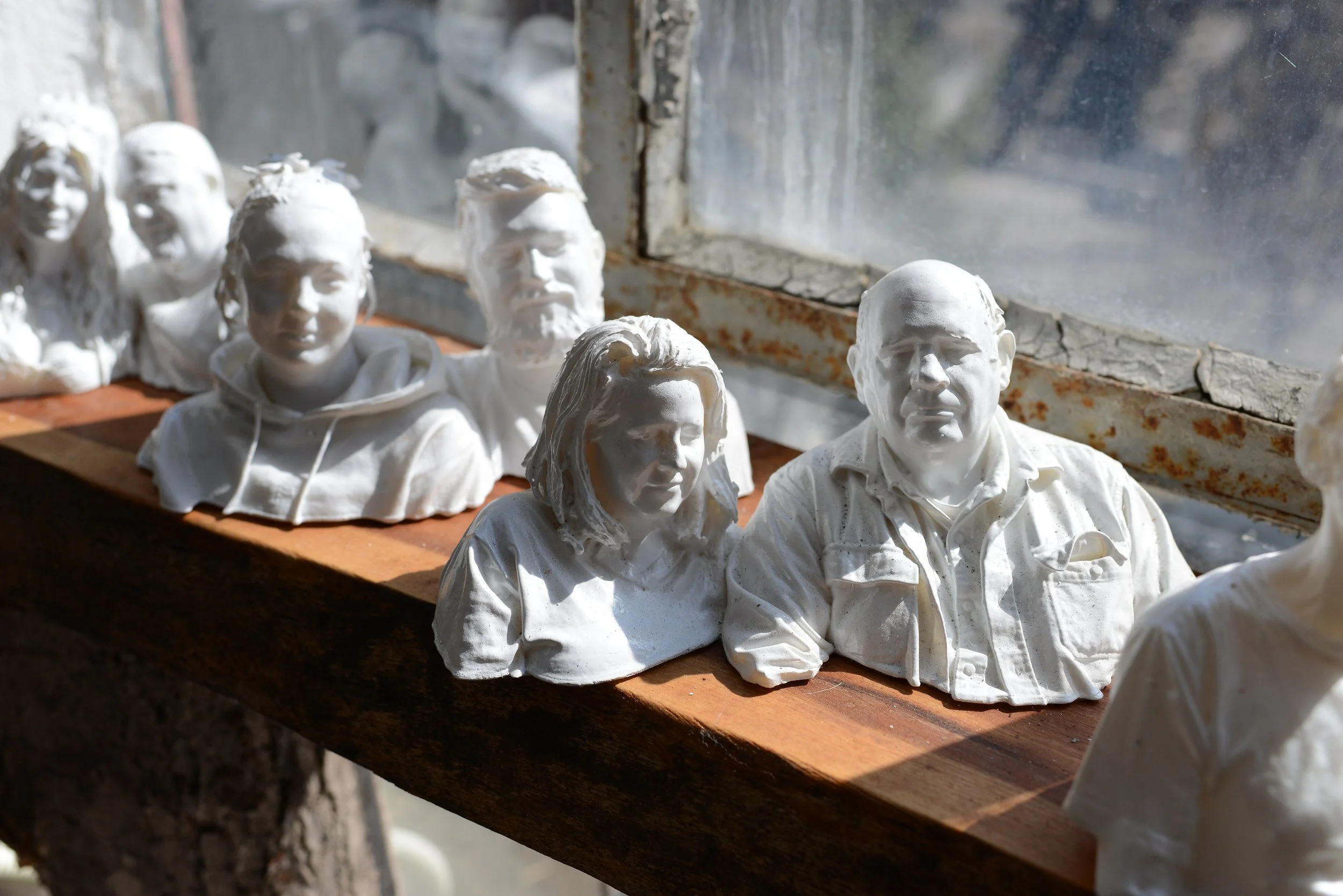 Geiger’s artistic process bridges decades of technological evolution. He traces the origins of his current practice back to an early iPhone app called 123D Catch, a now-defunct program that allowed users to take dozens of photos of an object and convert them into a 3D model a process known as photogrammetry. “You’d take 50 or 100 pictures from all angles, send them off, and get back a 3D dataset,” he recalls. “That was the beginning.” Armed with that data, Geiger made his first 3D print at the Fayetteville Free Library one of the first libraries in the world to offer public access to 3D printing. The result fascinated him, but it wasn’t enough. “It was cool,” he says, “but it was ugly plasticky.” That dissatisfaction sparked years of experimentation. He built his own CNC router to carve sculptures from wood, navigating the limitations of three-axis machining, undercuts, and unpredictable grain patterns. Many of the wooden pieces still populate the studio, their organic textures contrasting with the precision of his newer resin works. “Wood is beautiful, but it’s unpredictable,” he explains. “You don’t know what’s inside until you cut it. Sometimes you get flaws you can’t fix.” The transition to resin printing marked a turning point. “The detail was incredible,” he says simply. It allowed him to capture subtle expressions, fine textures, and complex geometries that had previously been out of reach.