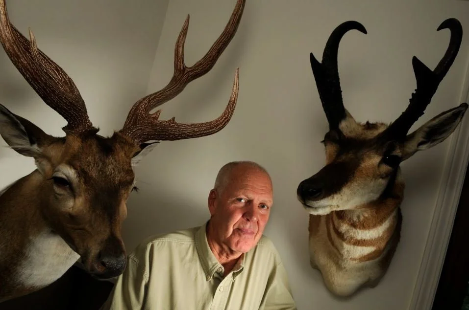 Photo Credit: Michelle Gabel. Phil Stewart, a retired biology teacher from Liverpool, is pictured with a pronghorn antelope from Wyoming on the right and an axis deer, native to India, on the left. For 19 of the past 20 years, Stewart has returned to Wyoming, often on his own, to hunt pronghorn antelope and mule deer.